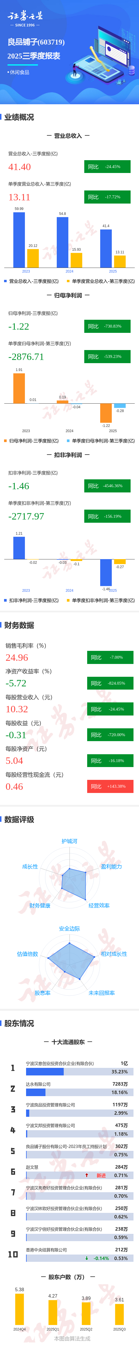 证券之星消息,良品铺子2025年三季报显示,前三季度公司主营收入41.4亿元,同比下降24.45%;归母净利润-1.22亿元,同比下降730.83%;扣非净利润-1.46亿元,同比下降4546.37%;其中2025年第三季度,公司单季度主营收入13.11亿元,同比下降17.72%;单季度归母净利润-2876.71万元,同比下降539.23%;单季度扣非净利润-2717.97万元,同比下降156.19%;负债率45.46%,投资收益-338.7万元,财务费用737.83万元,毛利率24.96%。