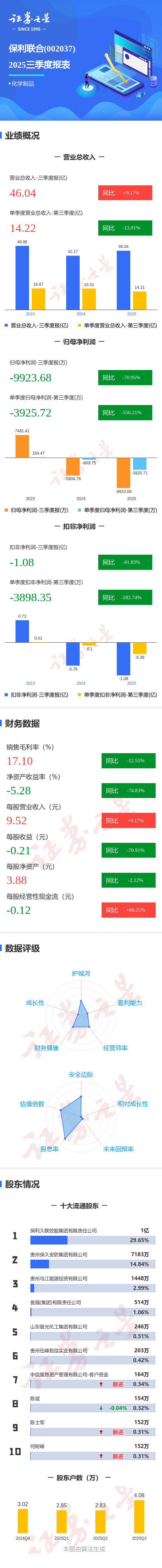 证券之星消息,保利联合2025年三季报显示,前三季度公司主营收入46.04亿元,同比上升9.17%;归母净利润-9923.68万元,同比下降70.96%;扣非净利润-1.08亿元,同比下降41.83%;其中2025年第三季度,公司单季度主营收入14.22亿元,同比下降13.91%;单季度归母净利润-3925.72万元,同比下降550.22%;单季度扣非净利润-3898.35万元,同比下降282.74%;负债率83.34%,投资收益247.37万元,财务费用2.13亿元,毛利率17.1%。