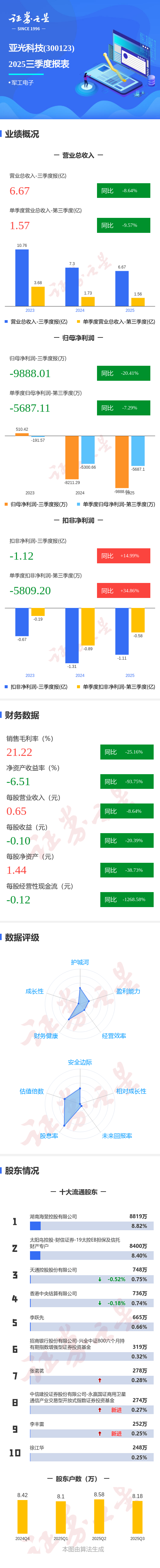 证券之星消息,亚光科技2025年三季报显示,前三季度公司主营收入6.67亿元,同比下降8.64%;归母净利润-9888.01万元,同比下降20.42%;扣非净利润-1.12亿元,同比上升15.0%;其中2025年第三季度,公司单季度主营收入1.57亿元,同比下降9.58%;单季度归母净利润-5687.11万元,同比下降7.29%;单季度扣非净利润-5809.2万元,同比上升34.86%;负债率66.1%,投资收益453.63万元,财务费用1.01亿元,毛利率21.22%。