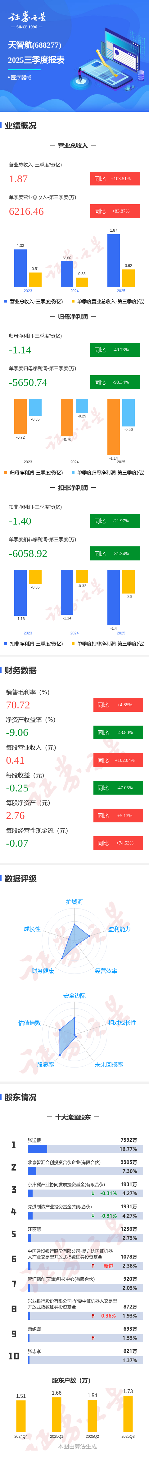 证券之星消息,天智航2025年三季报显示,前三季度公司主营收入1.87亿元,同比上升103.51%;归母净利润-1.14亿元,同比下降49.73%;扣非净利润-1.4亿元,同比下降21.97%;其中2025年第三季度,公司单季度主营收入6216.46万元,同比上升83.88%;单季度归母净利润-5650.74万元,同比下降90.34%;单季度扣非净利润-6058.92万元,同比下降81.34%;负债率27.29%,投资收益-679.87万元,财务费用786.73万元,毛利率70.72%。