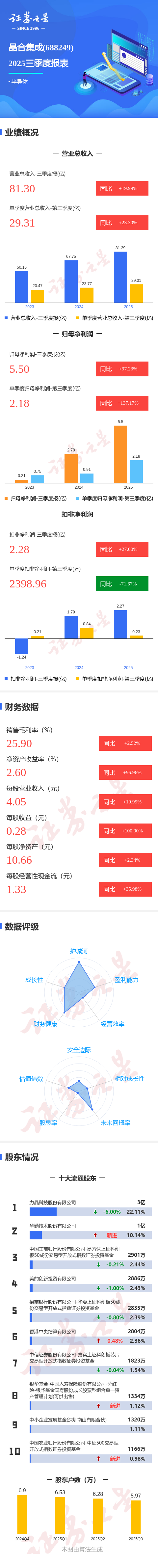 证券之星消息,晶合集成2025年三季报显示,前三季度公司主营收入81.3亿元,同比上升19.99%;归母净利润5.5亿元,同比上升97.24%;扣非净利润2.28亿元,同比上升27.01%;其中2025年第三季度,公司单季度主营收入29.31亿元,同比上升23.3%;单季度归母净利润2.18亿元,同比上升137.18%;单季度扣非净利润2398.96万元,同比下降71.68%;负债率49.33%,投资收益457.72万元,财务费用3.16亿元,毛利率25.9%。