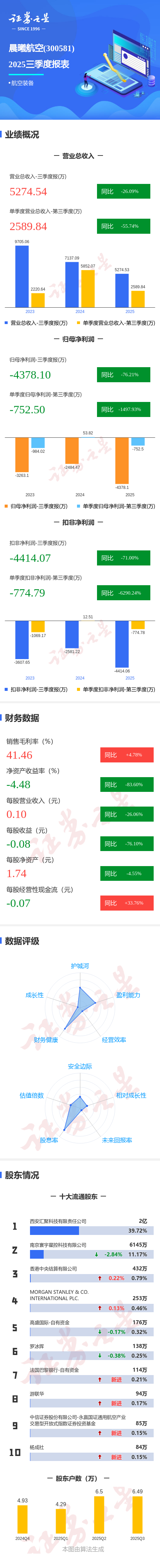 证券之星消息,晨曦航空2025年三季报显示,前三季度公司主营收入5274.54万元,同比下降26.1%;归母净利润-4378.1万元,同比下降76.22%;扣非净利润-4414.07万元,同比下降71.01%;其中2025年第三季度,公司单季度主营收入2589.84万元,同比下降55.74%;单季度归母净利润-752.5万元,同比下降1497.93%;单季度扣非净利润-774.79万元,同比下降6290.25%;负债率19.89%,投资收益39.04万元,财务费用-6.98万元,毛利率41.46%。