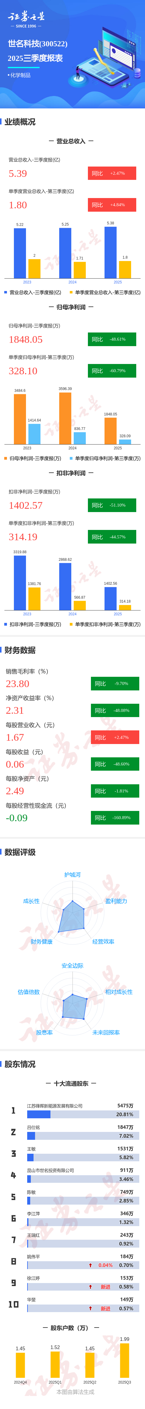 证券之星消息,世名科技2025年三季报显示,前三季度公司主营收入5.39亿元,同比上升2.48%;归母净利润1848.05万元,同比下降48.61%;扣非净利润1402.57万元,同比下降51.11%;其中2025年第三季度,公司单季度主营收入1.8亿元,同比上升4.85%;单季度归母净利润328.1万元,同比下降60.79%;单季度扣非净利润314.19万元,同比下降44.58%;负债率26.32%,投资收益250.58万元,财务费用322.61万元,毛利率23.8%。