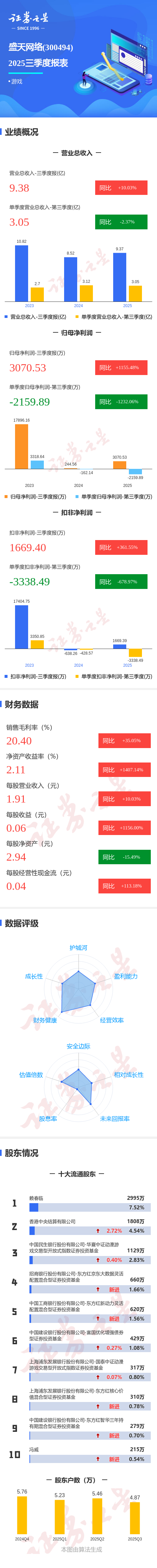 证券之星消息,盛天网络2025年三季报显示,前三季度公司主营收入9.38亿元,同比上升10.03%;归母净利润3070.53万元,同比上升1155.49%;扣非净利润1669.4万元,同比上升361.55%;其中2025年第三季度,公司单季度主营收入3.05亿元,同比下降2.38%;单季度归母净利润-2159.89万元,同比下降1232.06%;单季度扣非净利润-3338.49万元,同比下降678.97%;负债率8.68%,投资收益91.09万元,财务费用-606.05万元,毛利率20.4%。