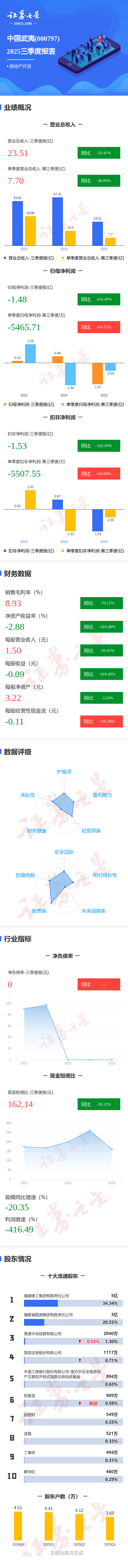 证券之星消息,中国武夷2025年三季报显示,前三季度公司主营收入23.51亿元,同比下降50.41%;归母净利润-1.48亿元,同比下降416.49%;扣非净利润-1.53亿元,同比下降326.5%;其中2025年第三季度,公司单季度主营收入7.7亿元,同比下降46.9%;单季度归母净利润-5465.71万元,同比上升64.51%;单季度扣非净利润-5507.55万元,同比上升63.7%;负债率76.8%,投资收益950.34万元,财务费用1.09亿元,毛利率8.93%。