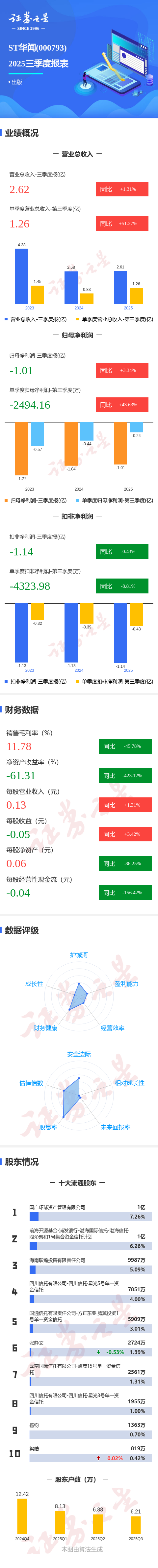 证券之星消息,ST华闻2025年三季报显示,前三季度公司主营收入2.62亿元,同比上升1.32%;归母净利润-1.01亿元,同比上升3.34%;扣非净利润-1.14亿元,同比下降0.43%;其中2025年第三季度,公司单季度主营收入1.26亿元,同比上升51.27%;单季度归母净利润-2494.16万元,同比上升43.64%;单季度扣非净利润-4323.98万元,同比下降8.82%;负债率80.79%,投资收益3603.59万元,财务费用6467.81万元,毛利率11.78%。