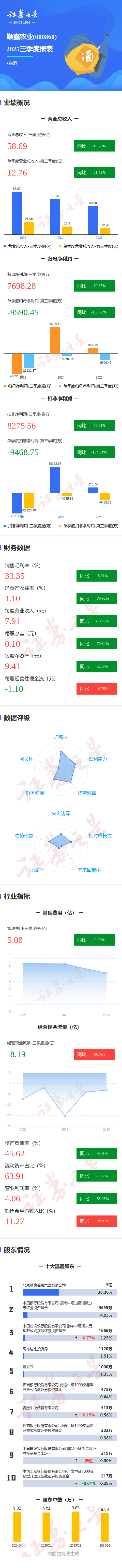 证券之星消息,顺鑫农业2025年三季报显示,前三季度公司主营收入58.69亿元,同比下降19.79%;归母净利润7698.28万元,同比下降79.85%;扣非净利润8275.56万元,同比下降78.31%;其中2025年第三季度,公司单季度主营收入12.76亿元,同比下降21.72%;单季度归母净利润-9590.45万元,同比下降136.75%;单季度扣非净利润-9468.75万元,同比下降134.64%;负债率45.62%,财务费用-5844.31万元,毛利率33.35%。