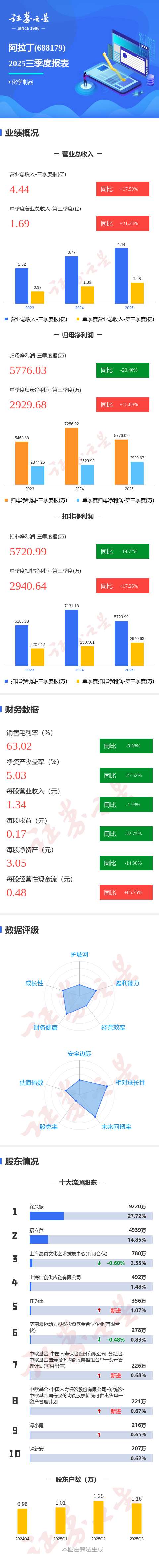 证券之星消息,阿拉丁2025年三季报显示,前三季度公司主营收入4.44亿元,同比上升17.59%;归母净利润5776.03万元,同比下降20.41%;扣非净利润5720.99万元,同比下降19.77%;其中2025年第三季度,公司单季度主营收入1.69亿元,同比上升21.26%;单季度归母净利润2929.68万元,同比上升15.8%;单季度扣非净利润2940.64万元,同比上升17.27%;负债率51.06%,投资收益313.19万元,财务费用1769.29万元,毛利率63.02%。