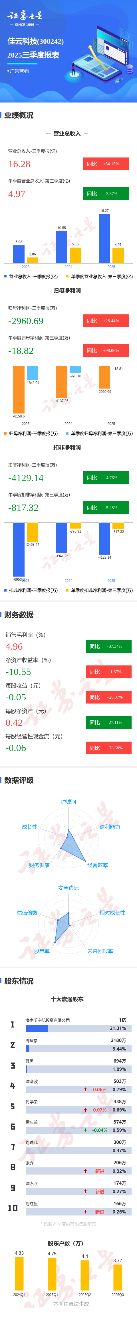证券之星消息,佳云科技2025年三季报显示,前三季度公司主营收入16.28亿元,同比上升54.15%;归母净利润-2960.69万元,同比上升28.45%;扣非净利润-4129.14万元,同比下降4.77%;其中2025年第三季度,公司单季度主营收入4.97亿元,同比下降3.58%;单季度归母净利润-18.82万元,同比上升98.06%;单季度扣非净利润-817.32万元,同比下降5.28%;负债率27.62%,投资收益1203.28万元,财务费用58.18万元,毛利率4.96%。