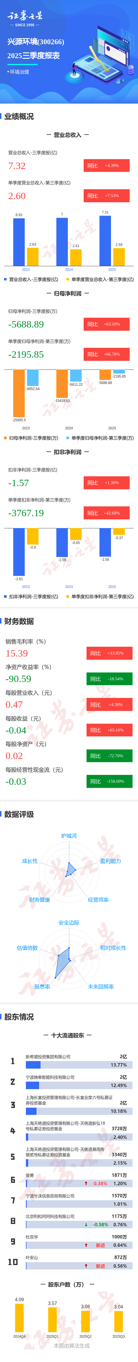 证券之星消息,兴源环境2025年三季报显示,前三季度公司主营收入7.32亿元,同比上升4.39%;归母净利润-5688.89万元,同比上升63.1%;扣非净利润-1.57亿元,同比上升1.31%;其中2025年第三季度,公司单季度主营收入2.6亿元,同比上升7.53%;单季度归母净利润-2195.85万元,同比上升66.79%;单季度扣非净利润-3767.19万元,同比上升42.68%;负债率92.86%,投资收益876.49万元,财务费用1.4亿元,毛利率15.39%。