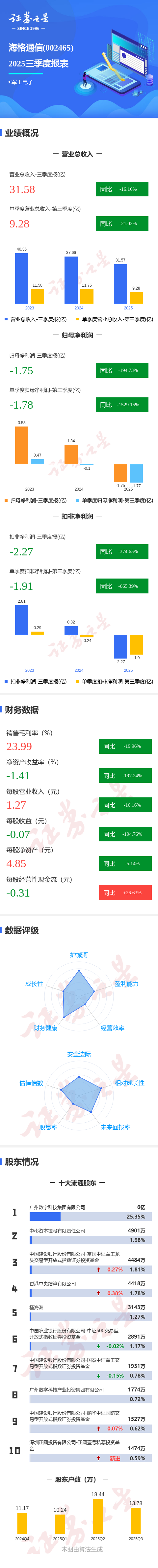 证券之星消息,海格通信2025年三季报显示,前三季度公司主营收入31.58亿元,同比下降16.17%;归母净利润-1.75亿元,同比下降194.73%;扣非净利润-2.27亿元,同比下降374.65%;其中2025年第三季度,公司单季度主营收入9.28亿元,同比下降21.02%;单季度归母净利润-1.78亿元,同比下降1529.15%;单季度扣非净利润-1.91亿元,同比下降665.4%;负债率40.46%,投资收益132.06万元,财务费用-192.67万元,毛利率23.99%。