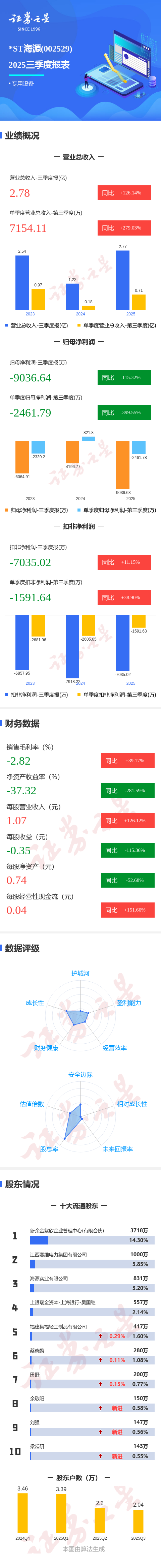 证券之星消息,*ST海源2025年三季报显示,前三季度公司主营收入2.78亿元,同比上升126.15%;归母净利润-9036.64万元,同比下降115.32%;扣非净利润-7035.02万元,同比上升11.15%;其中2025年第三季度,公司单季度主营收入7154.11万元,同比上升279.03%;单季度归母净利润-2461.79万元,同比下降399.56%;单季度扣非净利润-1591.64万元,同比上升38.9%;负债率75.72%,投资收益-1139.48万元,财务费用896.98万元,毛利率-2.82%。
