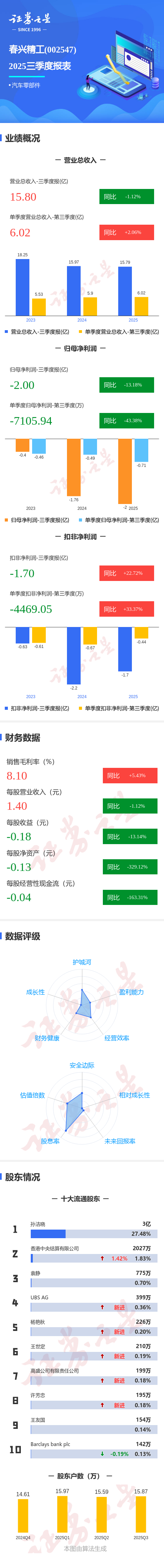 证券之星消息,春兴精工2025年三季报显示,前三季度公司主营收入15.8亿元,同比下降1.13%;归母净利润-2.0亿元,同比下降13.18%;扣非净利润-1.7亿元,同比上升22.73%;其中2025年第三季度,公司单季度主营收入6.02亿元,同比上升2.07%;单季度归母净利润-7105.94万元,同比下降43.38%;单季度扣非净利润-4469.05万元,同比上升33.38%;负债率102.99%,投资收益316.06万元,财务费用6300.24万元,毛利率8.1%。