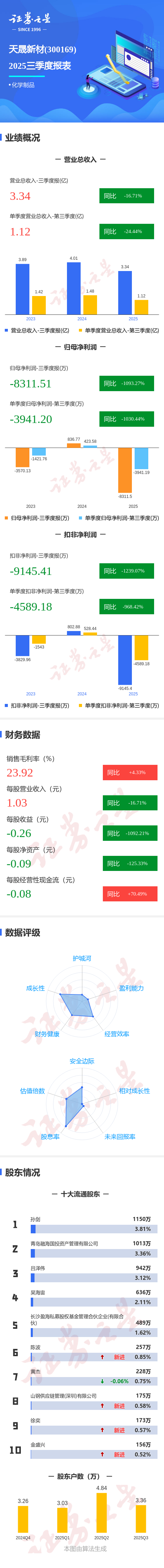 证券之星消息,天晟新材2025年三季报显示,前三季度公司主营收入3.34亿元,同比下降16.71%;归母净利润-8311.51万元,同比下降1093.28%;扣非净利润-9145.41万元,同比下降1239.07%;其中2025年第三季度,公司单季度主营收入1.12亿元,同比下降24.45%;单季度归母净利润-3941.2万元,同比下降1030.44%;单季度扣非净利润-4589.18万元,同比下降968.43%;负债率104.52%,投资收益82.1万元,财务费用2785.47万元,毛利率23.92%。