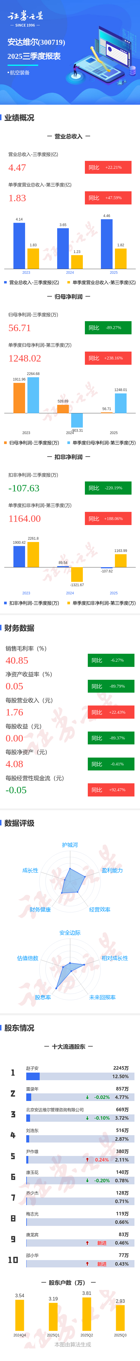 证券之星消息,安达维尔2025年三季报显示,前三季度公司主营收入4.47亿元,同比上升22.21%;归母净利润56.71万元,同比下降89.28%;扣非净利润-107.63万元,同比下降220.2%;其中2025年第三季度,公司单季度主营收入1.83亿元,同比上升47.6%;单季度归母净利润1248.02万元,同比上升238.16%;单季度扣非净利润1164.0万元,同比上升188.07%;负债率41.21%,投资收益-0.07万元,财务费用772.55万元,毛利率40.85%。
