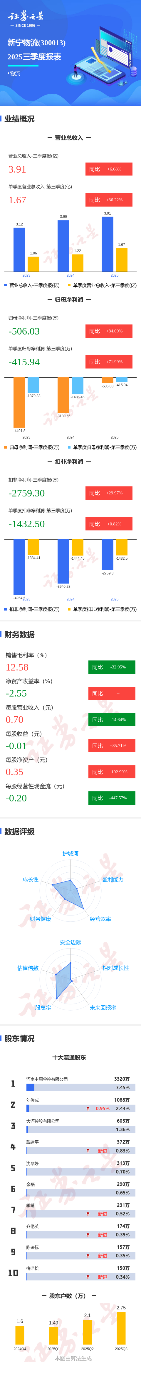 证券之星消息,新宁物流2025年三季报显示,前三季度公司主营收入3.91亿元,同比上升6.68%;归母净利润-506.03万元,同比上升84.09%;扣非净利润-2759.3万元,同比上升29.97%;其中2025年第三季度,公司单季度主营收入1.67亿元,同比上升36.23%;单季度归母净利润-415.94万元,同比上升72.0%;单季度扣非净利润-1432.5万元,同比上升0.83%;负债率62.04%,投资收益1165.38万元,财务费用786.61万元,毛利率12.58%。