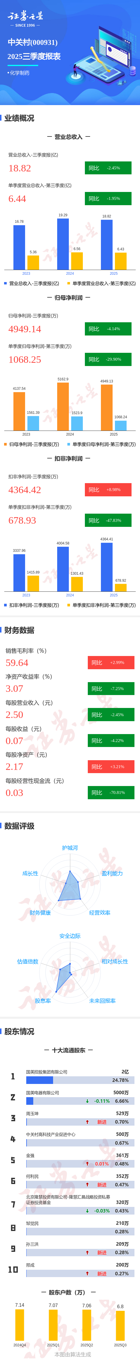 证券之星消息,中关村2025年三季报显示,前三季度公司主营收入18.82亿元,同比下降2.46%;归母净利润4949.14万元,同比下降4.14%;扣非净利润4364.42万元,同比上升8.99%;其中2025年第三季度,公司单季度主营收入6.44亿元,同比下降1.96%;单季度归母净利润1068.25万元,同比下降29.9%;单季度扣非净利润678.93万元,同比下降47.83%;负债率51.09%,投资收益-168.26万元,财务费用3613.22万元,毛利率59.64%。
