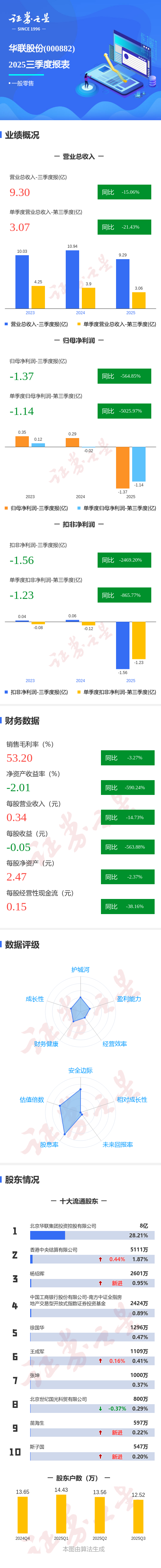 证券之星消息,华联股份2025年三季报显示,前三季度公司主营收入9.3亿元,同比下降15.07%;归母净利润-1.37亿元,同比下降564.85%;扣非净利润-1.56亿元,同比下降2469.2%;其中2025年第三季度,公司单季度主营收入3.07亿元,同比下降21.43%;单季度归母净利润-1.14亿元,同比下降5025.97%;单季度扣非净利润-1.23亿元,同比下降865.78%;负债率46.48%,投资收益2115.98万元,财务费用1.72亿元,毛利率53.2%。