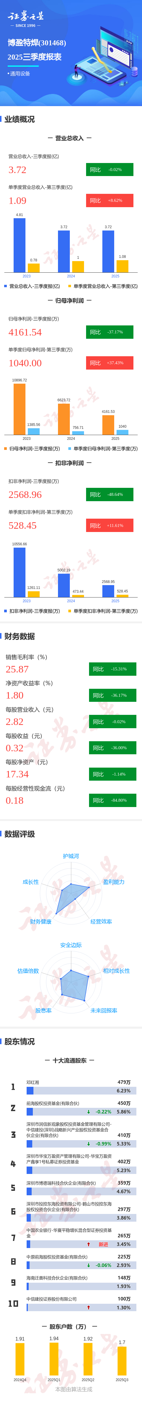 证券之星消息,博盈特焊2025年三季报显示,前三季度公司主营收入3.72亿元,同比下降0.03%;归母净利润4161.54万元,同比下降37.17%;扣非净利润2568.96万元,同比下降48.64%;其中2025年第三季度,公司单季度主营收入1.09亿元,同比上升8.63%;单季度归母净利润1040.0万元,同比上升37.44%;单季度扣非净利润528.45万元,同比上升11.62%;负债率11.23%,投资收益1010.49万元,财务费用-869.93万元,毛利率25.87%。