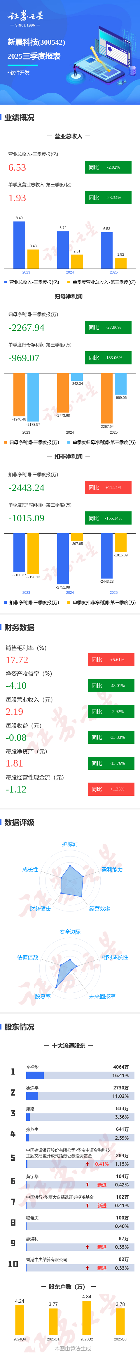 证券之星消息,新晨科技2025年三季报显示,前三季度公司主营收入6.53亿元,同比下降2.92%;归母净利润-2267.94万元,同比下降27.87%;扣非净利润-2443.24万元,同比上升11.22%;其中2025年第三季度,公司单季度主营收入1.93亿元,同比下降23.34%;单季度归母净利润-969.07万元,同比下降183.07%;单季度扣非净利润-1015.09万元,同比下降155.14%;负债率56.29%,投资收益25.37万元,财务费用568.55万元,毛利率17.72%。