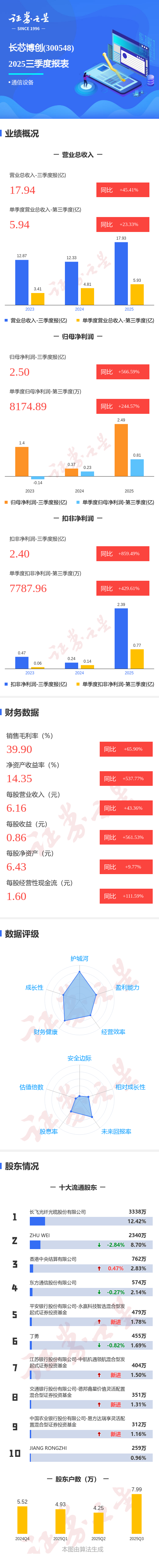 证券之星消息,长芯博创2025年三季报显示,前三季度公司主营收入17.94亿元,同比上升45.41%;归母净利润2.5亿元,同比上升566.59%;扣非净利润2.4亿元,同比上升859.5%;其中2025年第三季度,公司单季度主营收入5.94亿元,同比上升23.34%;单季度归母净利润8174.89万元,同比上升244.57%;单季度扣非净利润7787.96万元,同比上升429.61%;负债率31.28%,投资收益-461.19万元,财务费用620.39万元,毛利率39.9%。