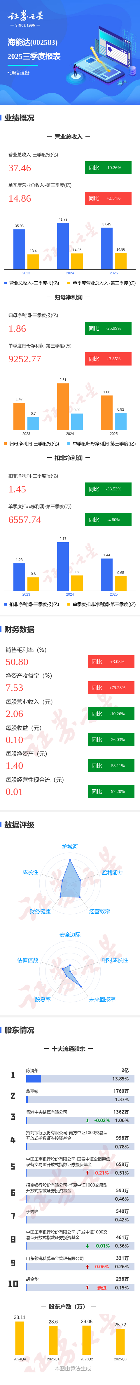 证券之星消息,海能达2025年三季报显示,前三季度公司主营收入37.46亿元,同比下降10.26%;归母净利润1.86亿元,同比下降26.0%;扣非净利润1.45亿元,同比下降33.53%;其中2025年第三季度,公司单季度主营收入14.86亿元,同比上升3.55%;单季度归母净利润9252.77万元,同比上升3.85%;单季度扣非净利润6557.74万元,同比下降4.8%;负债率74.69%,投资收益8332.31万元,财务费用-4399.05万元,毛利率50.8%。