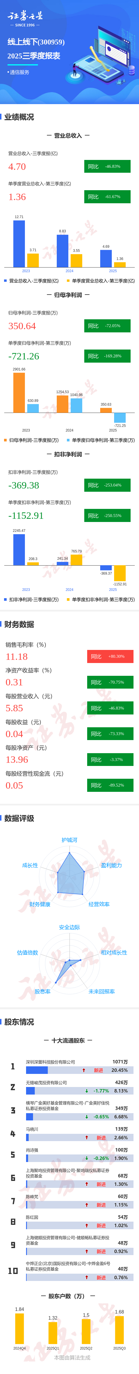 证券之星消息,线上线下2025年三季报显示,前三季度公司主营收入4.7亿元,同比下降46.84%;归母净利润350.64万元,同比下降72.05%;扣非净利润-369.38万元,同比下降253.05%;其中2025年第三季度,公司单季度主营收入1.36亿元,同比下降61.68%;单季度归母净利润-721.26万元,同比下降169.29%;单季度扣非净利润-1152.91万元,同比下降250.55%;负债率14.83%,投资收益581.85万元,财务费用-532.33万元,毛利率11.18%。