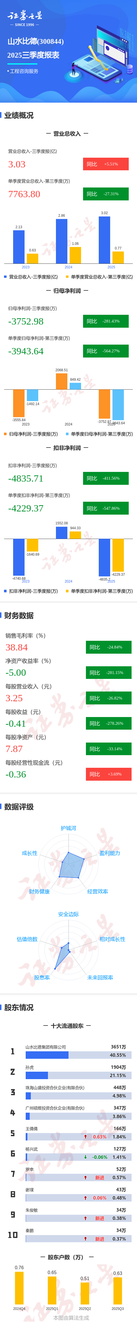 证券之星消息,山水比德2025年三季报显示,前三季度公司主营收入3.03亿元,同比上升5.52%;归母净利润-3752.98万元,同比下降281.43%;扣非净利润-4835.71万元,同比下降411.56%;其中2025年第三季度,公司单季度主营收入7763.8万元,同比下降27.31%;单季度归母净利润-3943.64万元,同比下降564.27%;单季度扣非净利润-4229.37万元,同比下降547.87%;负债率23.86%,投资收益190.69万元,财务费用33.49万元,毛利率38.84%。