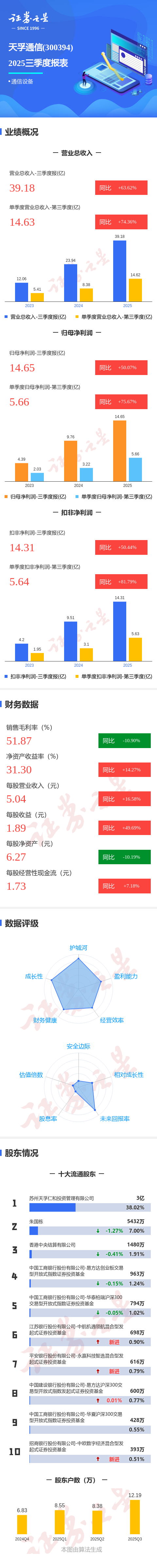 证券之星消息,天孚通信2025年三季报显示,前三季度公司主营收入39.18亿元,同比上升63.63%;归母净利润14.65亿元,同比上升50.07%;扣非净利润14.31亿元,同比上升50.44%;其中2025年第三季度,公司单季度主营收入14.63亿元,同比上升74.37%;单季度归母净利润5.66亿元,同比上升75.68%;单季度扣非净利润5.64亿元,同比上升81.79%;负债率16.45%,投资收益591.6万元,财务费用-3508.05万元,毛利率51.87%。