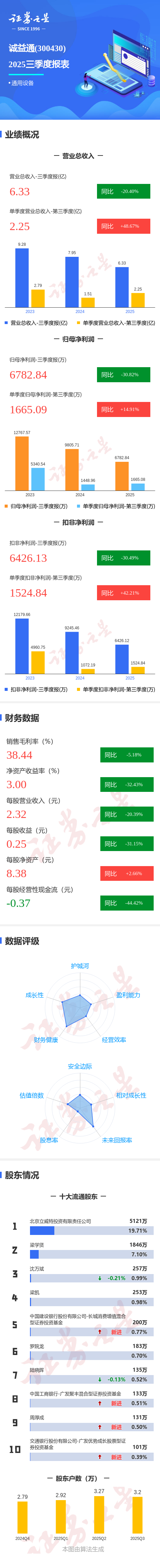 证券之星消息,诚益通2025年三季报显示,前三季度公司主营收入6.33亿元,同比下降20.4%;归母净利润6782.84万元,同比下降30.83%;扣非净利润6426.13万元,同比下降30.49%;其中2025年第三季度,公司单季度主营收入2.25亿元,同比上升48.67%;单季度归母净利润1665.09万元,同比上升14.92%;单季度扣非净利润1524.84万元,同比上升42.22%;负债率39.65%,投资收益-91.91万元,财务费用1767.54万元,毛利率38.44%。