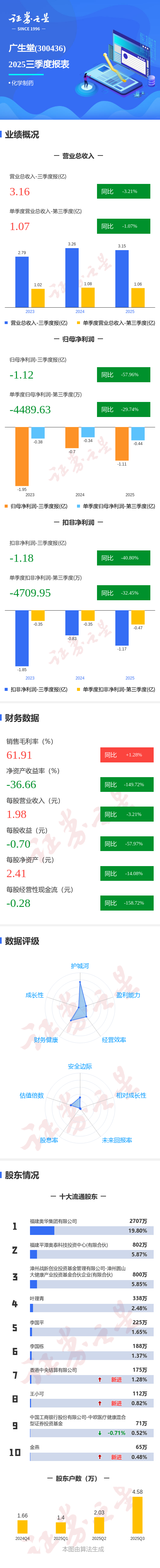 证券之星消息,广生堂2025年三季报显示,前三季度公司主营收入3.16亿元,同比下降3.21%;归母净利润-1.12亿元,同比下降57.96%;扣非净利润-1.18亿元,同比下降40.81%;其中2025年第三季度,公司单季度主营收入1.07亿元,同比下降1.07%;单季度归母净利润-4489.63万元,同比下降29.75%;单季度扣非净利润-4709.95万元,同比下降32.46%;负债率69.18%,投资收益-243.17万元,财务费用2469.45万元,毛利率61.91%。