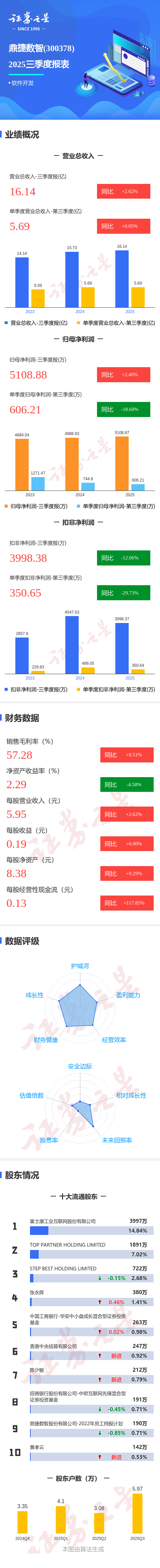 证券之星消息,鼎捷数智2025年三季报显示,前三季度公司主营收入16.14亿元,同比上升2.63%;归母净利润5108.88万元,同比上升2.4%;扣非净利润3998.38万元,同比下降12.07%;其中2025年第三季度,公司单季度主营收入5.69亿元,同比上升0.06%;单季度归母净利润606.21万元,同比下降18.61%;单季度扣非净利润350.65万元,同比下降29.74%;负债率31.99%,投资收益163.83万元,财务费用-690.99万元,毛利率57.28%。