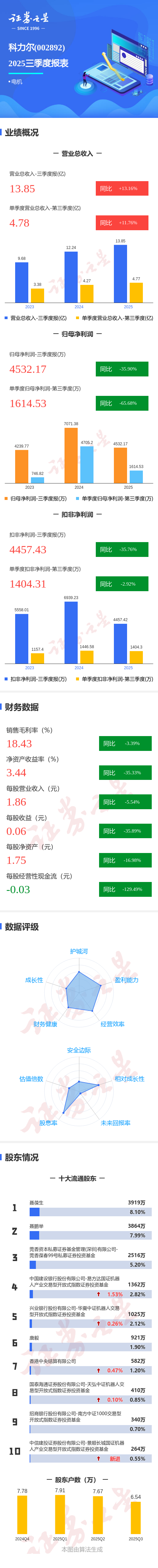 证券之星消息,科力尔2025年三季报显示,前三季度公司主营收入13.85亿元,同比上升13.16%;归母净利润4532.17万元,同比下降35.91%;扣非净利润4457.43万元,同比下降35.76%;其中2025年第三季度,公司单季度主营收入4.78亿元,同比上升11.77%;单季度归母净利润1614.53万元,同比下降65.69%;单季度扣非净利润1404.31万元,同比下降2.92%;负债率51.11%,投资收益-1158.34万元,财务费用794.85万元,毛利率18.43%。