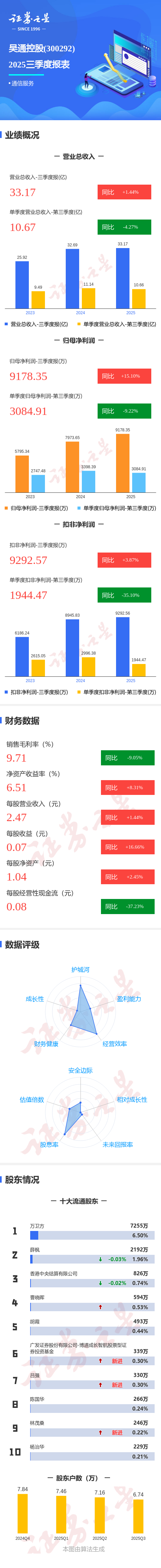 证券之星消息,吴通控股2025年三季报显示,前三季度公司主营收入33.17亿元,同比上升1.45%;归母净利润9178.35万元,同比上升15.11%;扣非净利润9292.57万元,同比上升3.88%;其中2025年第三季度,公司单季度主营收入10.67亿元,同比下降4.28%;单季度归母净利润3084.91万元,同比下降9.22%;单季度扣非净利润1944.47万元,同比下降35.11%;负债率40.71%,投资收益-24.34万元,财务费用618.95万元,毛利率9.71%。