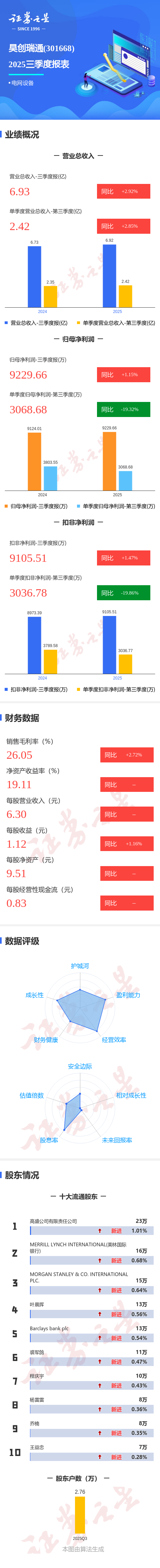 证券之星消息,昊创瑞通2025年三季报显示,前三季度公司主营收入6.93亿元,同比上升2.93%;归母净利润9229.66万元,同比上升1.16%;扣非净利润9105.51万元,同比上升1.47%;其中2025年第三季度,公司单季度主营收入2.42亿元,同比上升2.85%;单季度归母净利润3068.68万元,同比下降19.32%;单季度扣非净利润3036.78万元,同比下降19.87%;负债率19.01%,投资收益32.65万元,财务费用-103.51万元,毛利率26.05%。