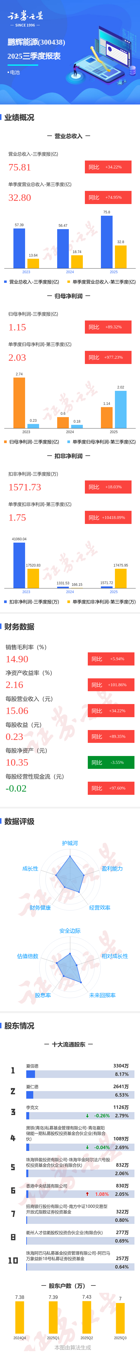 证券之星消息,鹏辉能源2025年三季报显示,前三季度公司主营收入75.81亿元,同比上升34.23%;归母净利润1.15亿元,同比上升89.33%;扣非净利润1571.73万元,同比上升18.04%;其中2025年第三季度,公司单季度主营收入32.8亿元,同比上升74.96%;单季度归母净利润2.03亿元,同比上升977.24%;单季度扣非净利润1.75亿元,同比上升10418.09%;负债率73.62%,投资收益6586.56万元,财务费用7665.92万元,毛利率14.9%。