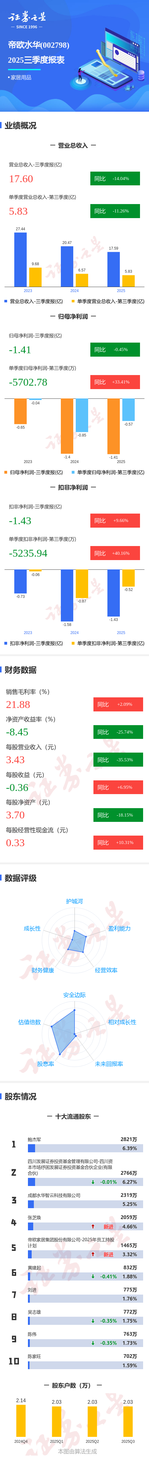 证券之星消息,帝欧水华2025年三季报显示,前三季度公司主营收入17.6亿元,同比下降14.04%;归母净利润-1.41亿元,同比下降0.45%;扣非净利润-1.43亿元,同比上升9.67%;其中2025年第三季度,公司单季度主营收入5.83亿元,同比下降11.26%;单季度归母净利润-5702.78万元,同比上升33.42%;单季度扣非净利润-5235.94万元,同比上升40.17%;负债率63.49%,投资收益185.79万元,财务费用1.02亿元,毛利率21.88%。