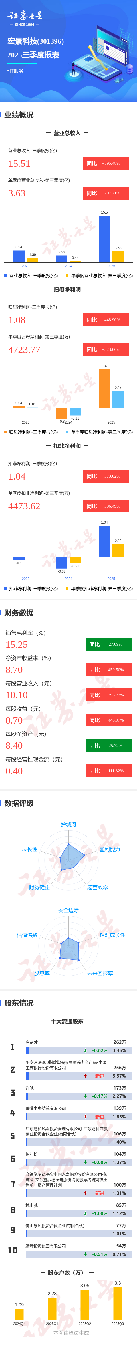 证券之星消息,宏景科技2025年三季报显示,前三季度公司主营收入15.51亿元,同比上升595.49%;归母净利润1.08亿元,同比上升448.91%;扣非净利润1.04亿元,同比上升373.02%;其中2025年第三季度,公司单季度主营收入3.63亿元,同比上升707.72%;单季度归母净利润4723.77万元,同比上升323.01%;单季度扣非净利润4473.62万元,同比上升306.5%;负债率72.37%,投资收益-21.62万元,财务费用2881.09万元,毛利率15.25%。