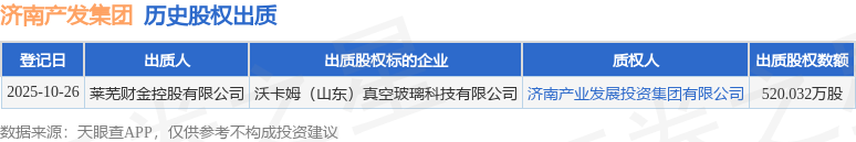 证券之星消息,根据天眼查APP显示,在10月26日登记的一则股权出质信息(登记编号:370163202510241961)中,莱芜财金控股有限公司出质其所持有的沃卡姆(山东)真空玻璃科技有限公司股权,出质股权数额为520.032万股,质权人为济南产业发展投资集团有限公司。