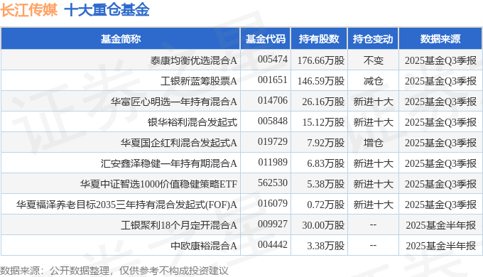 持有长江传媒最多的基金为泰康均衡优选混合A,目前规模为4.03亿元,最新净值1.8074(10月29日),较上一交易日上涨0.57%,近一年上涨18.46%。该基金现任基金经理为桂跃强。