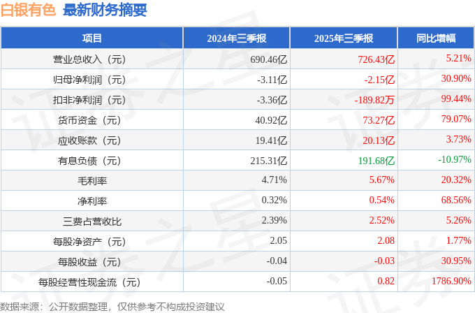 据证券之星公开数据整理,近期白银有色(601212)发布2025年三季报。截至本报告期末,公司营业总收入726.43亿元,同比上升5.21%,归母净利润-2.15亿元,同比上升30.9%。按单季度数据看,第三季度营业总收入280.84亿元,同比上升70.72%,第三季度归母净利润224.12万元,同比上升100.69%。本报告期白银有色盈利能力上升,毛利率同比增幅20.32%,净利率同比增幅68.56%。