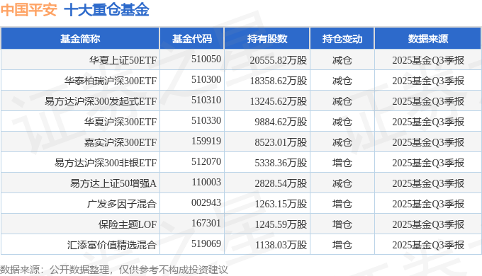 持有中国平安最多的基金为华夏上证50ETF,目前规模为804.54亿元,最新净值3.2104(10月29日),较上一交易日上涨0.41%,近一年上涨16.72%。该基金现任基金经理为徐猛。