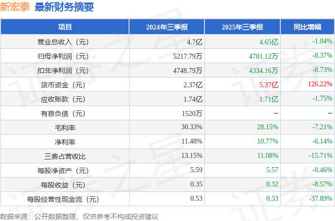 据证券之星公开数据整理,近期新宏泰(603016)发布2025年三季报。截至本报告期末,公司营业总收入4.65亿元,同比下降1.04%,归母净利润4781.12万元,同比下降8.37%。按单季度数据看,第三季度营业总收入1.58亿元,同比上升1.83%,第三季度归母净利润1353.84万元,同比下降6.89%。本报告期新宏泰公司应收账款体量较大,当期应收账款占最新年报归母净利润比达241.95%。