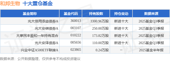 持有和邦生物最多的基金为光大信用添益债券A,目前规模为52.21亿元,最新净值1.265(10月29日),较上一交易日上涨1.2%,近一年上涨28.34%。该基金现任基金经理为黄波。