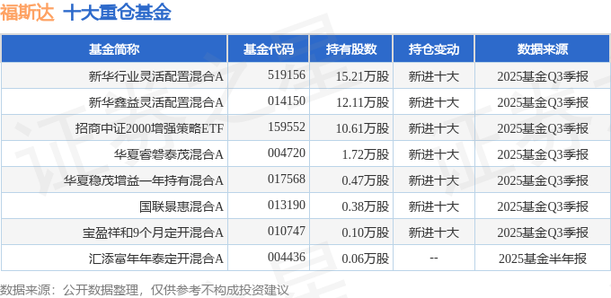 持有福斯达最多的基金为新华行业灵活配置混合A,目前规模为2.54亿元,最新净值1.0021(10月29日),较上一交易日上涨0.94%,近一年上涨0.54%。该基金现任基金经理为张大江。