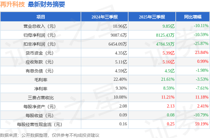 据证券之星公开数据整理,近期再升科技(603601)发布2025年三季报。截至本报告期末,公司营业总收入9.85亿元,同比下降10.11%,归母净利润8125.43万元,同比下降10.59%。按单季度数据看,第三季度营业总收入3.27亿元,同比下降5.37%,第三季度归母净利润2096.65万元,同比上升42.42%。本报告期再升科技公司应收账款体量较大,当期应收账款占最新年报归母净利润比达568.71%。