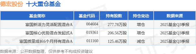 持有德宏股份最多的基金为富国新活力灵活配置混合A,目前规模为4.13亿元,最新净值3.3421(10月29日),较上一交易日上涨0.28%,近一年上涨41.02%。该基金现任基金经理为吴栋栋。