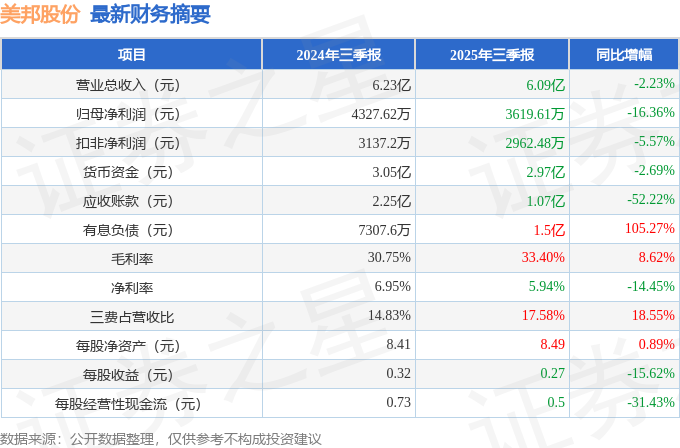 据证券之星公开数据整理,近期美邦股份(605033)发布2025年三季报。截至本报告期末,公司营业总收入6.09亿元,同比下降2.23%,归母净利润3619.61万元,同比下降16.36%。按单季度数据看,第三季度营业总收入1.24亿元,同比上升9.17%,第三季度归母净利润5.88万元,同比上升101.42%。本报告期美邦股份公司应收账款体量较大,当期应收账款占最新年报归母净利润比达291.46%。