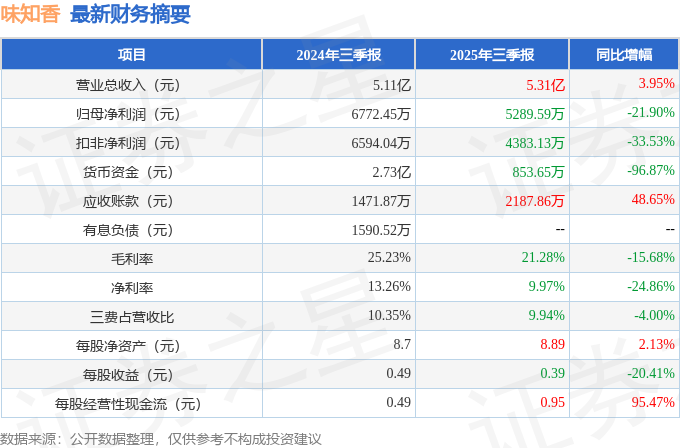 据证券之星公开数据整理,近期味知香(605089)发布2025年三季报。根据财报显示,味知香增收不增利。截至本报告期末,公司营业总收入5.31亿元,同比上升3.95%,归母净利润5289.59万元,同比下降21.9%。按单季度数据看,第三季度营业总收入1.88亿元,同比上升2.61%,第三季度归母净利润2094.91万元,同比下降17.64%。