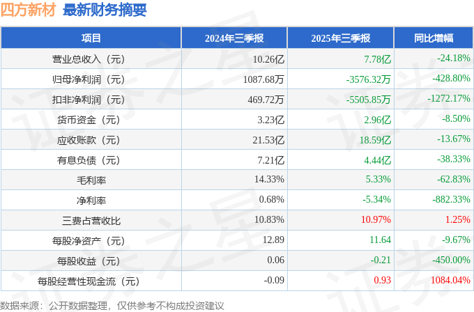 据证券之星公开数据整理,近期四方新材(605122)发布2025年三季报。截至本报告期末,公司营业总收入7.78亿元,同比下降24.18%,归母净利润-3576.32万元,同比下降428.8%。按单季度数据看,第三季度营业总收入2.38亿元,同比下降27.57%,第三季度归母净利润-943.71万元,同比下降2105.9%。本报告期四方新材公司应收账款体量较大,当期应收账款占最新年报营业总收入比达131.63%。